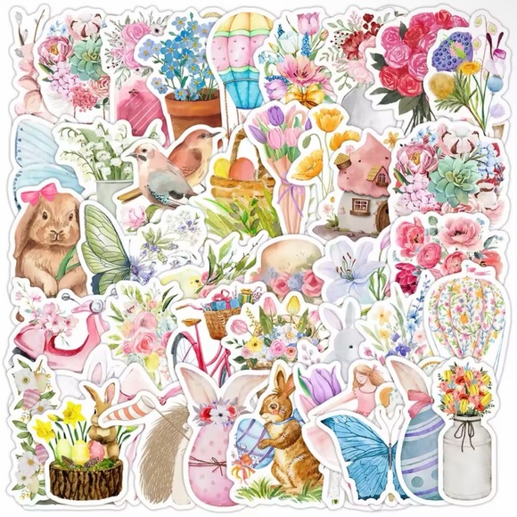 Vibrant sticker set featuring flowers, bunnies, and balloons. Perfect for crafts and decoration.