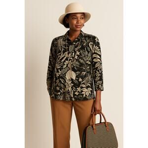 Elegant navy-and-tan coordinated outfit styled for effortless sophistication. Features a tropical-print Erika tunic in soft cotton-blend fabric, paired with classic tan wool Laurel Ralph Lauren slacks for a polished look. A cream felt hat, striped handbag, and two-tone metallic leaf necklace complete the ensemble with warm, modern charm. Perfect for brunch, Sunday outings, or transitional-season events. Pieces may also be purchased individually. Quality, texture, and color coordination make this a standout set for timeless style on a budget.