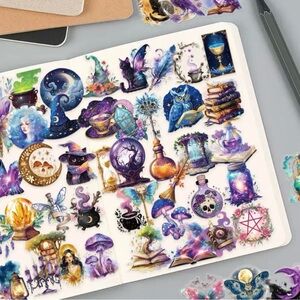 Brand new set of 50 stickers. Mystical is the theme. The set has lots of purple and blue crystals moons stars nature trees mushrooms and lots more. Perfect for Halloween.