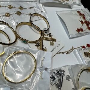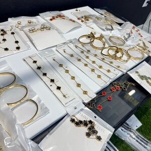 This stunning jewelry set features elegant gold and vibrant red floral designs, perfect for adding a touch of sophistication to any outfit. Crafted with attention to detail, this set is a must-have for any jewelry collection. 50 pcs Lot