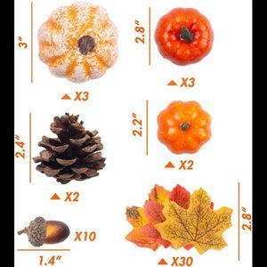 -PACKAGE INCLUDED - 3 x Fake Pumpkin ( 2.8" in diameter, 3" in height ), 3 x Fake Pumpkin (2.4" in diameter, 2.4" in height) , 2 x Fake Pumpkin ( 2" in diameter, 1.9" in height ), 30 x Fake Maple Leaf (3.2" × 2.8"), 10 x Fake Acorn (0.8" in diameter, 1.2" in height), 2 x Fake Pine Cone (2.28" in diameter, 2.4" in height ), all packed in a black mesh bag. (basket is not included)