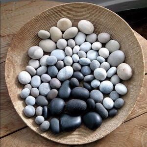Set of 50 Lake Michigan ombré beach rocks for decor. Colors ranging from off-white/light grey to dusty orange/red. So beautiful displayed in a basket or dough bowl like pictured of the blue rocks I have listed as well! Sizes range from 1-4 inches wide.