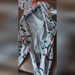 This cozy kids one piece features halloween with bats pattern in gray and orange. Perfect for keeping your little one comfortable and stylish. zipper zips from the feet to the chest for easy changing of child.