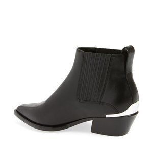 A gleaming logo pate brings curvy counterpoint to the broken-heel and blunted-toe geometries of a smart Chelsea bootie with unapologetic kick. - Approx. 1 1/2" heel - Approx. 4 1/2" shaft - Pull-on style with side goring - Imported