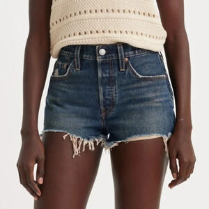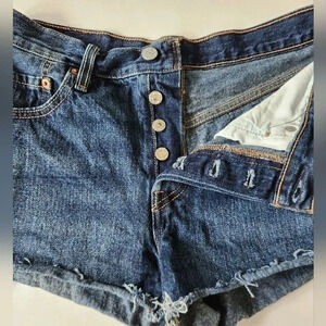 Levi 501's in a size 27 with a dark rinse. These are ultra short cutoffs with a button fly. They have 2 front hip pockets, and 2 back pockets. These are a summer classic!