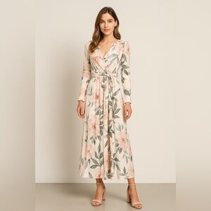 Elevate your wardrobe with this brand new En Focus Studio maxi dress. This floral wrap-style dress features a flattering V-neckline, long sleeves, and a tie waist for a figure-enhancing silhouette. The lightweight fabric and romantic print make it perfect for both fall and spring occasions—whether you’re headed to brunch, a garden wedding, or a casual day out.
