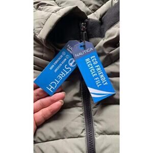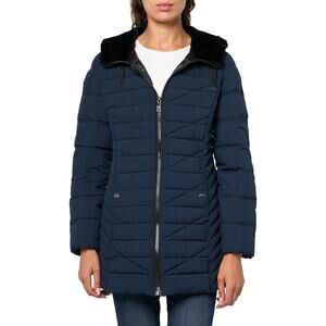5064 NWT Nautica Womens Hooded Packable Stretch Puffer Coat Navy Blue Large