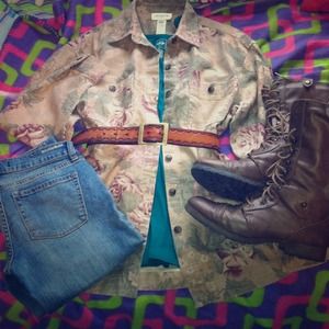 This is a really neat button-down from Jones New York. It's a linen/cotton blend and it's heavy and warm! Wear it belted with a tank, or wear it as a jacket. It seems like it could be very versatile. Jeans are for sale as well... Ask me about bundles!