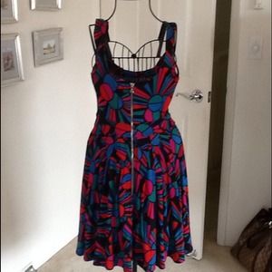 Sassy dress in bold colors has a pleated bodice and a ruffle neckline. The back is embellished with an oversize zipper. Falls just above the knee. Worn just a couple of times. Looks new.