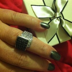 It is a gorgeous rhodium plated ring with black and clear cubic zirconias