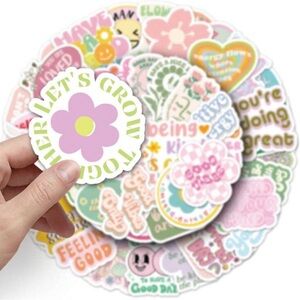 Vibrant sticker pack with positive messages. Features pink, green, and yellow colors.