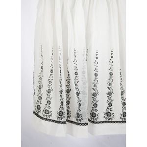 This adorable 50s dress features a black top & flocked border print on a white skirt. 3 white nonfunctional buttons in the front. Peter Pan collar. Button-down closure down center back & on the belt. TaggedMiss Quality, Union label, 75% nylon, 25% cotton, size 12. Excellent condition, no visible flaws.