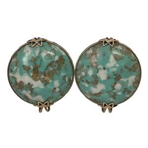 Stunning robin egg blue with white & metallic gold speckles round domed art glass cabochons framed with square edged gold-filled wire & two (2) filigree prongs ear slide or ear clip earrings circa 1950's. Unsigned, these are attributed to Hillcraft or Castlecraft Jewelry Designers, Each measure 1 inch wide by 1-1/8 inches tall. Although pre-owned, the earrings are in excellent condition appearing have never been worn. No nicks, chips or cracks in the cabochons. No metal wear. The clips still fit tight. Consider the pictures to be part of the description. Don’t hesitate to ask any questions.