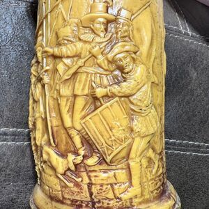 Had been used some has melted wax down sides with much left to give. A 1950s Johann Gunter carved wax candle from Germany, featuring a 3D design of a Musketeers drummer. The candle is in the shape of a cylinder and stands 6.5 inches tall. It is a specialized candle with historical figures and periods & styles as its theme, making it a unique decorative collectible for adults.