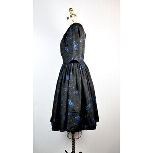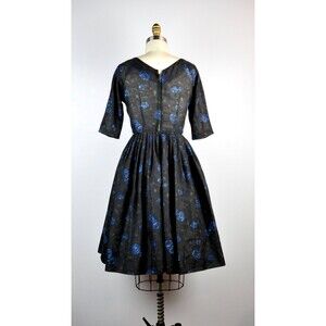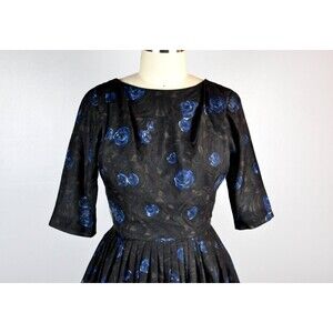 50s Novelty Print BLUE ROSES Dress - Pleated Full Skirt Dress - Bombshell S M