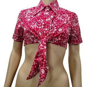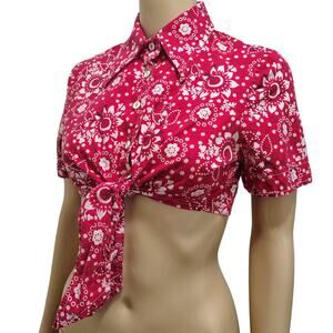 50s Red Cropped Bandana Kerchief Print Button Up Knot Tie Shirt Top Size 10 Juniors
