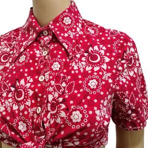 50s Red Cropped Floral Bandana Kerchief Print Button Up Knot Tie Shirt Top. Fold over collar has wing tips. Five white plastic buttons. Seam detail around each arm cuff.