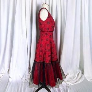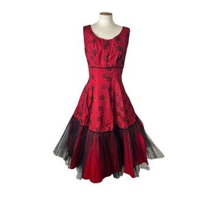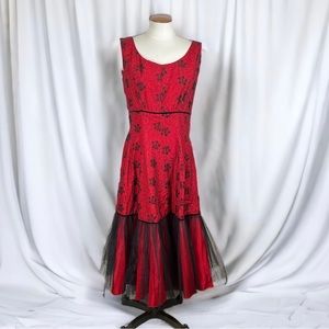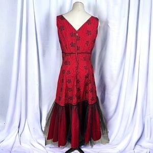 50s Red Taffeta and Black Tulle and Lace Party Circle Skirt Dress