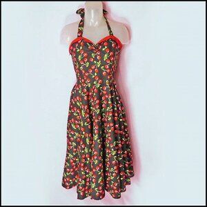 50s STYLE Sun Dress Black Cherry Print PinUp Fit Flare Halter is 90s Vintage