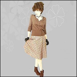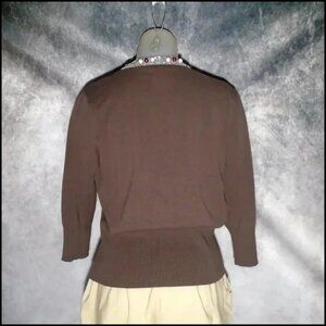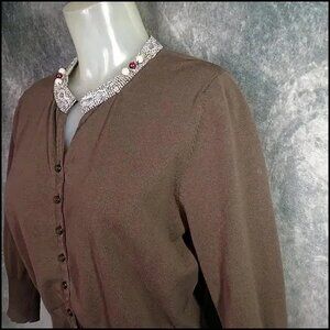 Fool people. This is from the 90s but is styled after late 50s early 60s cardigans: Bracelet length sleeves, beads around the neck , and bloused above the wide ribbing in back AND IT'S A LARGE SIZE! Quality blend of Silk, nylon, spandex. Cocoa brown. Can be worn as cardigan or knit top. Neckline has fancy beading all the way around. Not too blingy. It's flawless and unused vintage. There are many who prefer reproductions instead of real vintage because they last longer.
