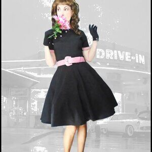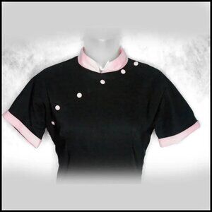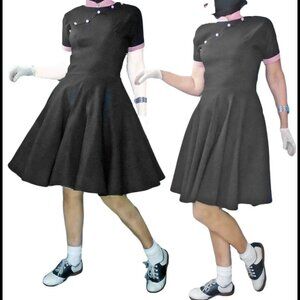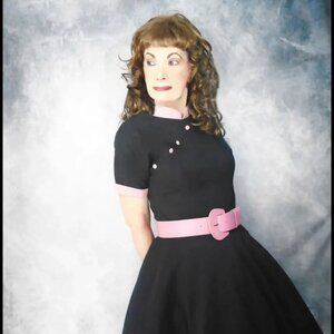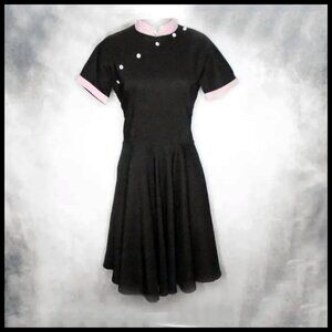Great 50s look with a little Asian influence, just like the dresses of that period. Pink Mandarin collar with slanting pink buttons. Full skirt, no belt loops (belt shown not included). Fabric is a micro fiber twill with about 2'' of horizontal stretch. IMPOSSIBLE to wrinkle! Back nylon zipper. Label shown (old Logo). Shown with and without crinoline. Large size too. CONDITION? Clean and flawless.