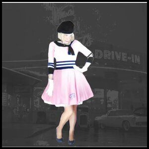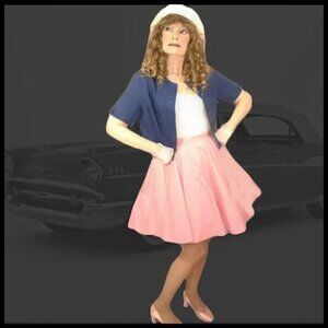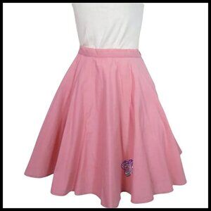 Rock this women's (or girl's) fit and flare circle skirt with crinoline Rockabilly style or your own way. It can work into a 50s Rockabilly chick costume also. (Anyone doing "Grease" these days?) It's home-made and it was either shortened or made for a petite woman or a girl. For girls, a normal length or short circle skirt for women. Pink 100% cotton. Attached stiff white tulle crinoline holds its shape, but added crinoline was used in some pics. Thin waistband, one button closure, pink metal side zipper. Sequin butterfly applique may have been added later. Cannot be made longer, hem is top-stitched. CONDITION: no flaws, clean and ready to Rockabilly.