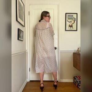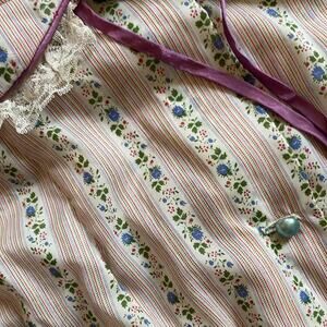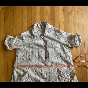 This is a darling 1950s dressing gown made by Campus girl. slightly sheer, feels like it is likely made of nylon. It is short sleeved and buttons down the front with blue pearlescent buttons. Has two big front pockets and a frilly lace sleeve and collar. Also ties at the neck with a purple ribbon. The robe is a striped floral pattern in blues, greens, reds, whites. Marked a size 14 with measurements in photos - approximately a modern small to medium.