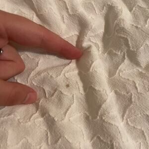 One small spot on the underside. One loose thread. No major signs of wear or age. May need further cleaning from storage.