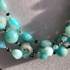 After seeing this necklace my fashion editor friend sent me a screen shot from Amazon's Mrs. Maisel series S2 E6 because the necklace (made before the show) is so similar to this one!! The triple-strand necklace is 20" long with strands of round, oval and shaped beads and crystals. The robin's egg blue is especially soft and easy to wear. Updating the '50s, are blue-green crystal drop earrings that coordinate superbly with this one-of-a-kind handmade BP Designs suite.