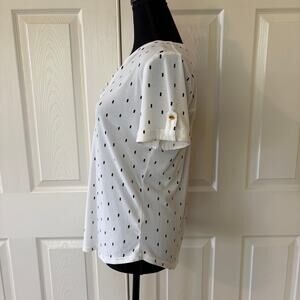 Chic and lightweight white blouse with a subtle black dotted pattern from 50th Street Petite. Features a flattering split neckline with fabric-covered buttons, cuffed short sleeves with decorative gold-tone button tabs, and a flowy fit. A versatile piece that can easily be styled for work, casual outings, or layered under blazers.