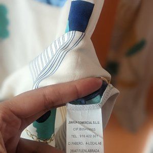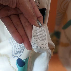 Abstract Floral pattern with green, light blue, navy white, multi-colored blouse