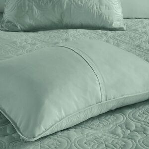 510 Design Oakley 3 Piece Reversible Bedspread Set offers a simple and stylish addition to your bedroom decor. A quilted medallion technique is displayed on the seafoam bedspread and shams, adding dimension and charm to the top of the bed. Unlike traditional coverlets or quilts, this bedspread is oversized to drape better and features 100% hypoallergenic polyester filling. Made from ultra-soft microfiber, this oversized cover up is machine washable for easy care and adds a chic transitional allure to your bedroom.
