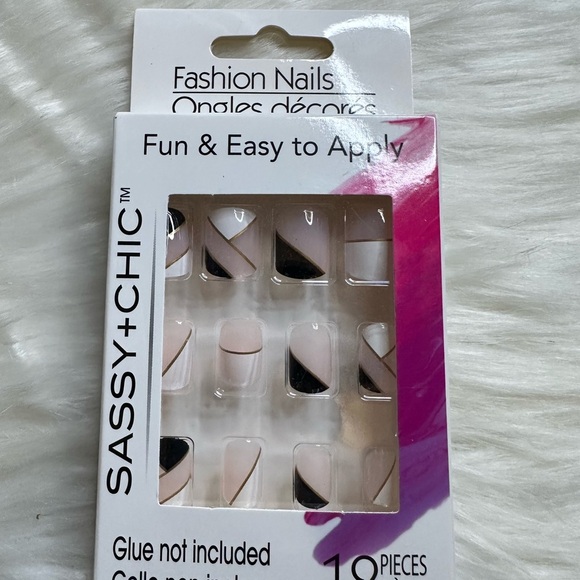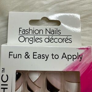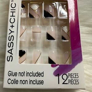 Stylish press-on nails with black, white, and tan designs. Easy to apply.