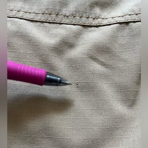There is a very small pinhole in the left pant leg, please see last photo.