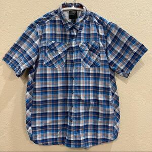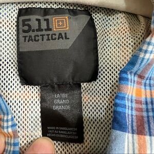 EUC. The 5.11 Tactical Men's Blue Plaid Inside Mesh Pearl Snap Shirt in size L is a versatile and durable option for outdoor enthusiasts. Made from a blend of polyester and nylon, this shirt features a collared neckline with a cutaway collar style and snap closure. The shirt is designed for easy care and machine washable, making it practical for casual occasions in the summer, fall, or spring. With a multicolor plaid pattern and button accents, this shirt embodies a rugged outdoor theme perfect for gorpcore or hunting enthusiasts.