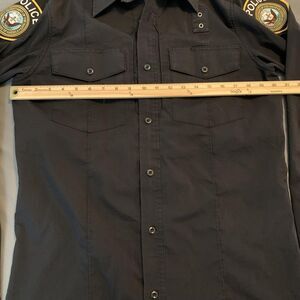Design details: Collared shirt with two button-flap chest pockets, shoulder areas with sewn-on police patches, and small grommet detail at upper chest for equipment attachment.