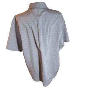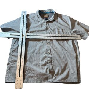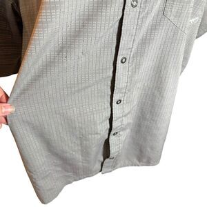 Selling as is, please see photos. The product is a men's large short sleeve snap shirt in gray color, made of polyester material. It features a solid pattern, collared neckline, and a regular fit. The shirt is machine washable and has stretch performance for added comfort and flexibility. This button-up shirt is designed for everyday casual wear and is part of the 5.11 Tactical brand, known for quality and durability in outdoor and tactical clothing.
