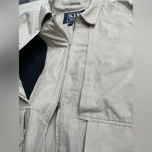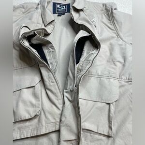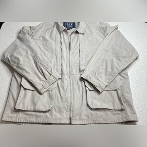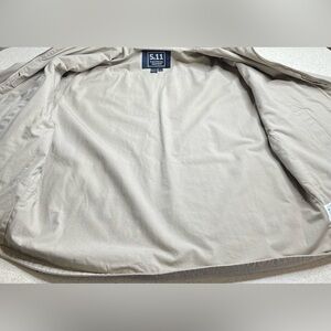 Stylish tan jacket by 5.11 Tactical. Features multiple pockets. Perfect for outdoor activities.