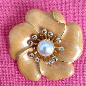 This is a beautiful brooch I purchased from Macy's but never wore. It has simulated pinkish diamonds and a large pearl in the center making it a real statement piece! The petals on the brooch are lined in a thin border of gilt. It will surely make a blazer or dress pop! It is approximately 1 3/4" in diameter.