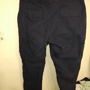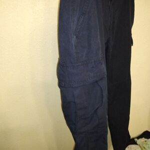 Navy blue, cargo pants. Seat is reinforced, Cotton polyester blend. Waist 18". inseam 31"