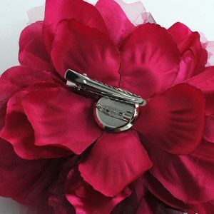 Large fabric flower with organza petals in burgundy color assembled with pin and hair clip on back. Color: Burgundy; Size: 5-1/2 inches
