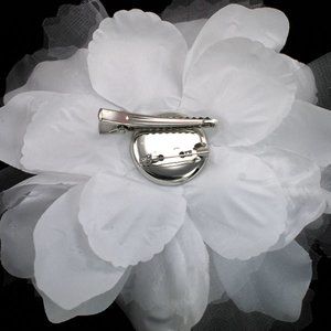 Large fabric flower with organza petals in white color assembled with pin and hair clip on back. Color: White. Size: 5-1/2 inches wide