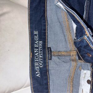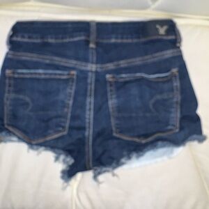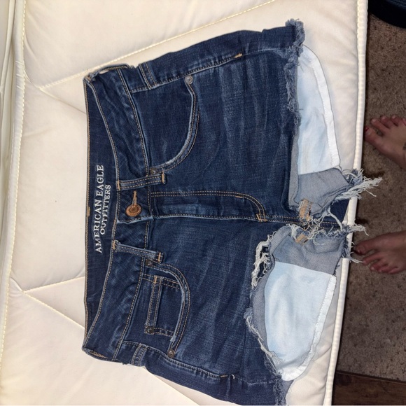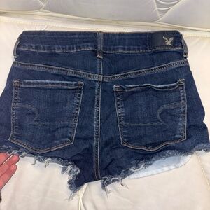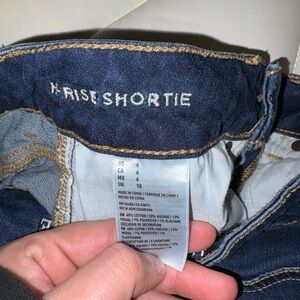 Trendy distressed jean shorts. Perfect for casual wear. Classic blue denim look.