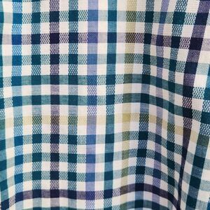 Excellent used condition. Multi-colored plaid cotton/poly blend long sleeve shirt. Button down collar. Haggar Clothing Stretch. Pit to pit is about 27", sleeve length is 25", neck about 20".