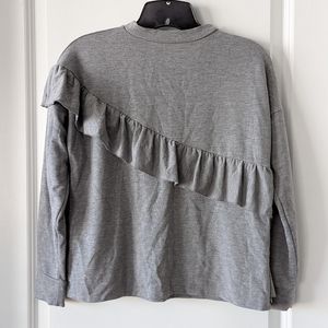 Tiered ruffle with floral embroidery on right shoulder. lightweight sweater.