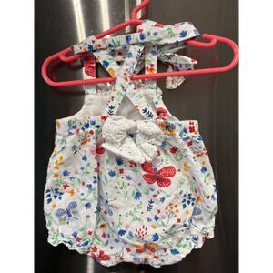 The white romper features a beautiful floral pattern with delicate flowers and butterflies, adding a touch of charm.