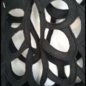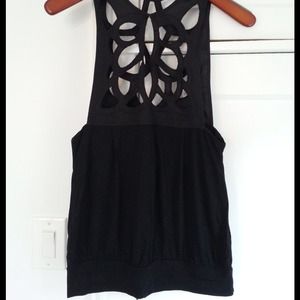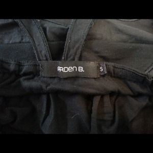 Arden B. black tank blouse with such pretty cut-outs as shown in the third photo. Has hook & eye closure in the front with a thick fabric band around bottom of top. Features a little built in bralette to be worn strapless. The photos do not do this top justice! It is so pretty in person & looks amazing on. In Great condition. Size is Small.