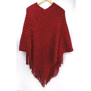 ❤️5/$15💚Assimetrical Knit Openwork Shevron Red Poncho with Fringe ONE PLUS Size