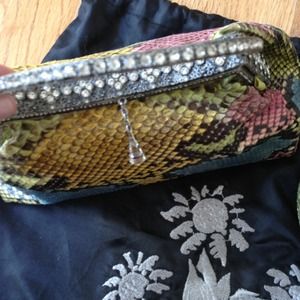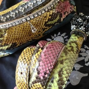 Clara Kasavina rainbow snakeskin evening bag and belt with Swarovski crystal detail set in aged sterling silver. These were custom made by Clara (makes accessories for all celebrities/red carpet) and are one of a kind. Belt fits XL 32-36. 100% real sterling silver/Swarovski/snake. Ask me to sell individual and I can! **can also be purchased individually.