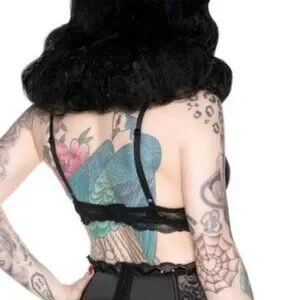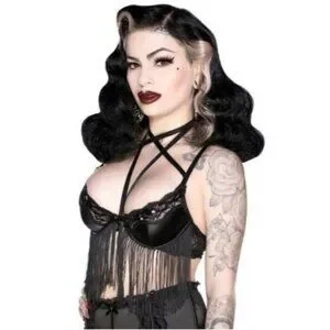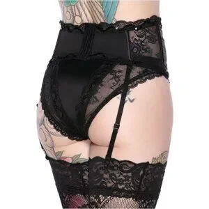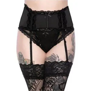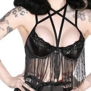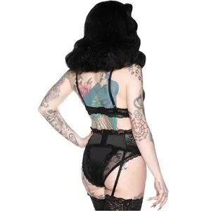 A dark little masterpiece—this Killstar She’s Poison set pairs a fringe‑trimmed bra w/ a matching lace garter belt, blending gothic attitude w/ burlesque movement.